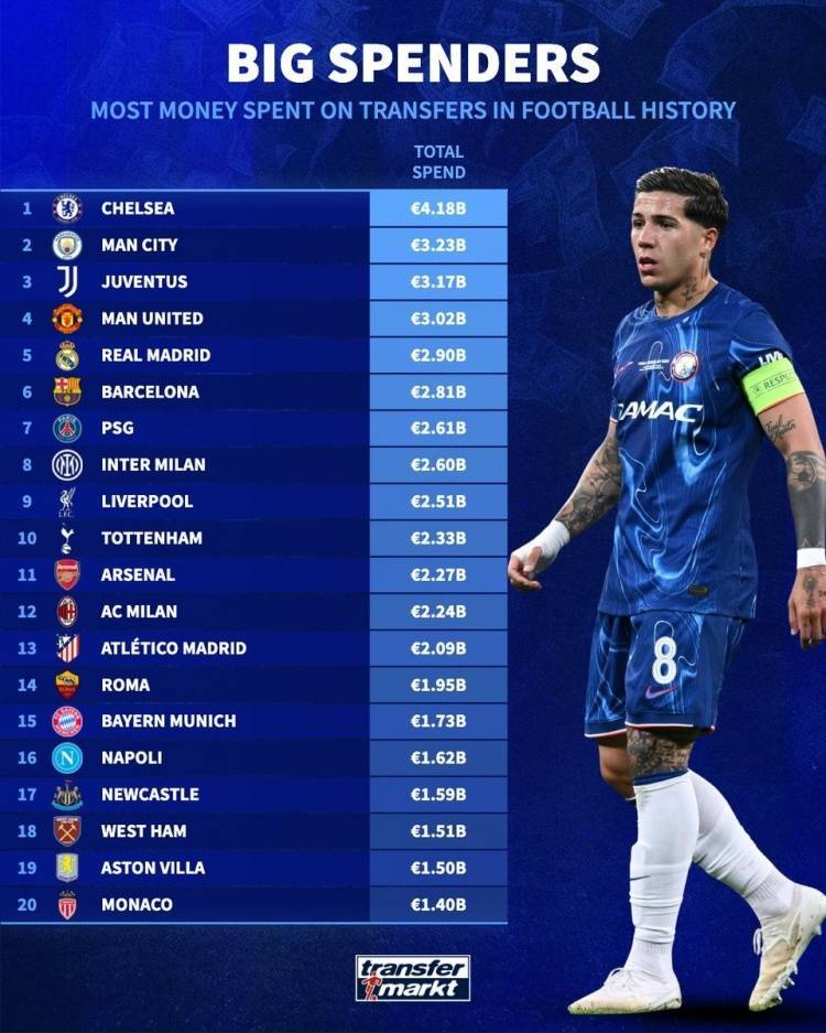 德转列历史转会费支出前20:切尔西领衔英超9队,意甲5队&西甲3队
